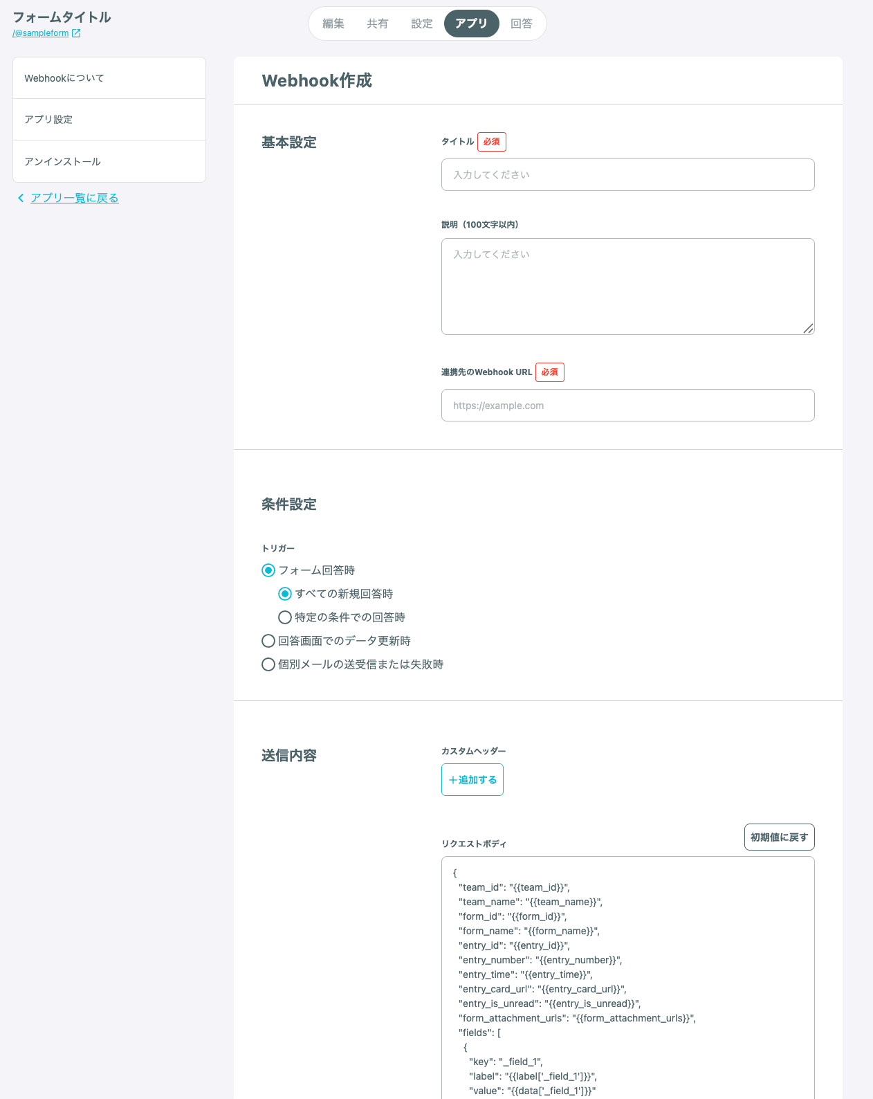 - Webhook作成画面で項目の設定を行う